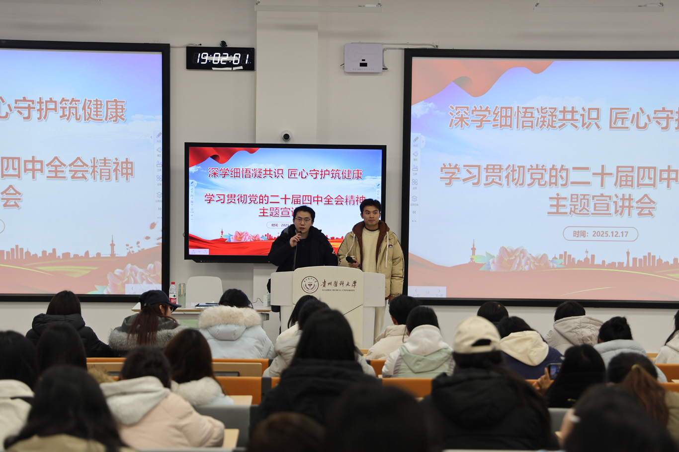 整场宣讲既有政策解读的高度,又有专业分析的深度,更有贴近学生的温度。通过两位老师的精彩互动与生动阐释,学生们不仅深刻理解了党的二十届四中全会精神的核心要义,更明晰了护理专业的发展前景与自身的成长方向,纷纷表示将以全会精神为指引,扎实学好专业知识,锤炼人文素养,努力成长为有仁心、有匠艺、有担当、有眼界的新时代护理人才。